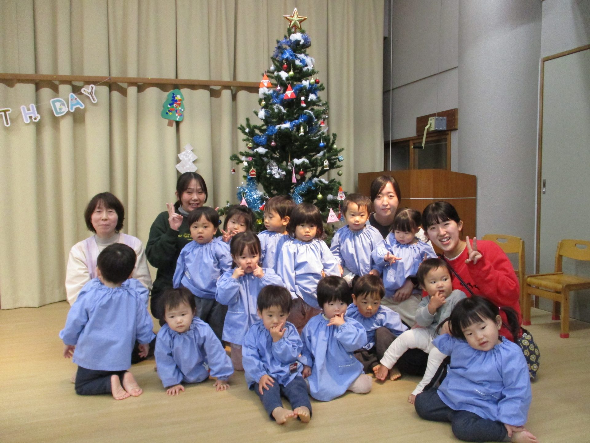 12月24日にはクリスマスお誕生会がありました☺華組さんもステージのツリーでハイチーズ✨