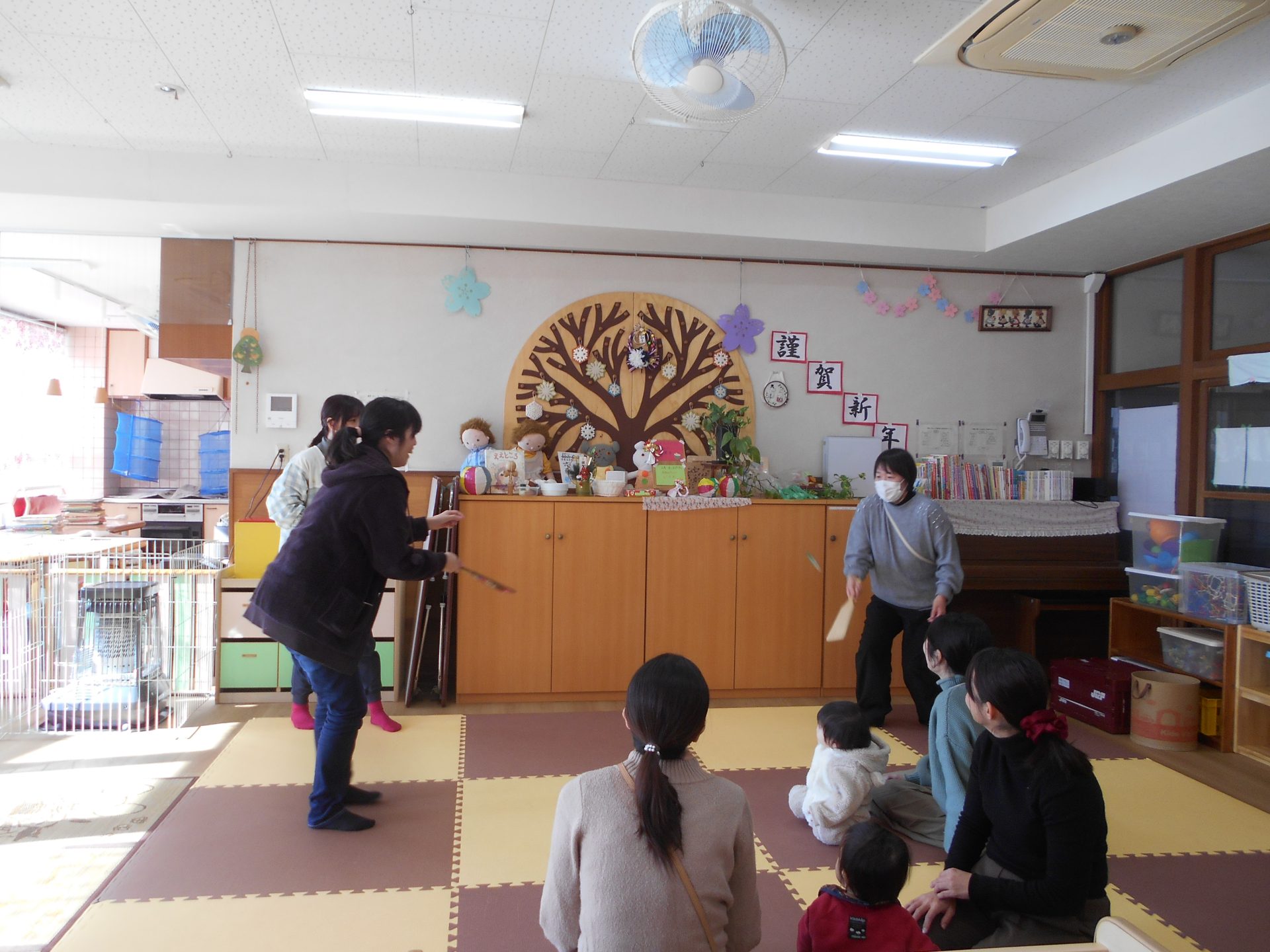 伝承遊びをご紹介。今では貴重な羽子板もお見せすることができました。