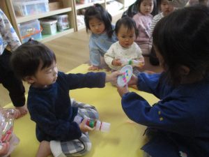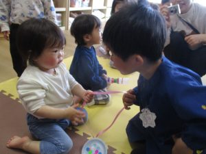 空・星・風・虹組さんはプレイルームでお別れ会をし、異年齢のチームに分かれてペアで大玉転がしや手を繋いでのリレー、フルーツバスケットを楽しみました!(^^)!。