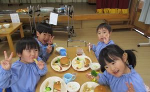 給食は先生を含めてみんなで食べました。メニューも手作りハンバーガーやポテトで子ども達は大喜びでたくさん食べていました。