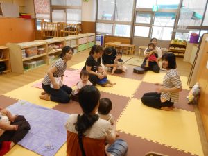 わらべうたをしたり、大判タオルでゆらゆら心地よい時間。