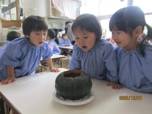 虹組さんでは、カボチャの器にカレーを入れて、絵本の料理を作ってみました!