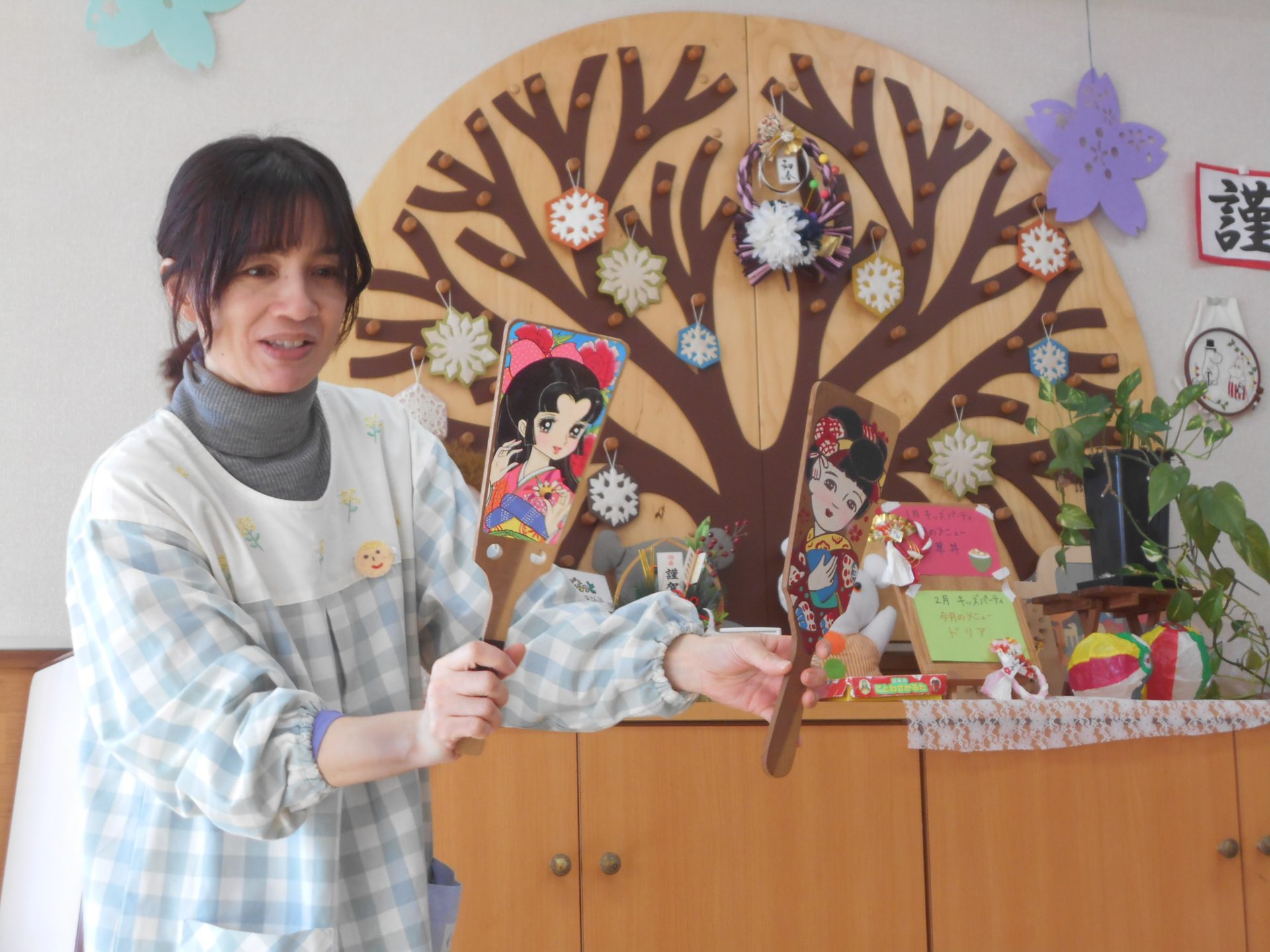 伝承遊びをご紹介。今では貴重な羽子板もお見せすることができました。