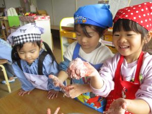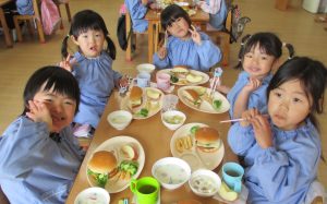 給食は先生を含めてみんなで食べました。メニューも手作りハンバーガーやポテトで子ども達は大喜びでたくさん食べていました。